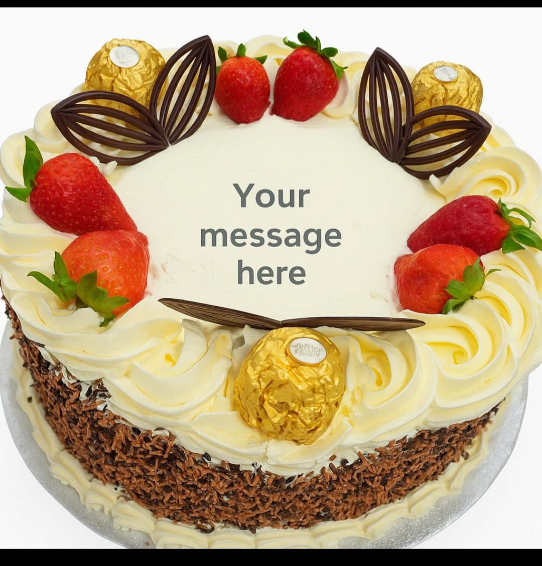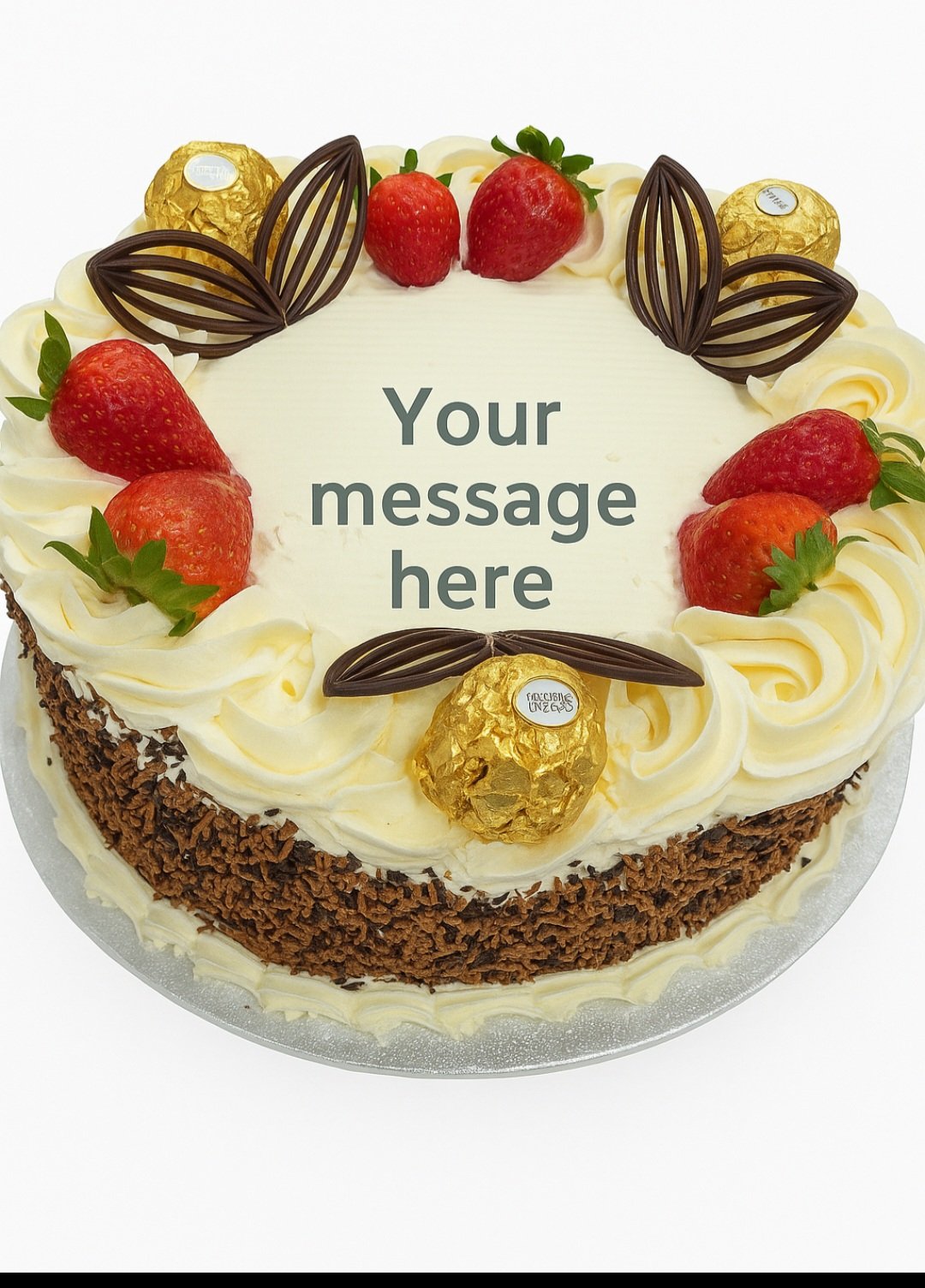 A beautifully handcrafted egg-free fresh cream cake, made with your choice of soft Victoria sponge or rich chocolate sponge. Filled with either mixed fruit jam or smooth chocolate spread, this cake is decorated with fresh strawberries, Ferrero Rocher chocolates, elegant chocolate lattices, and finished with silky swirls of fresh cream. Perfect for any celebration, it combines elegance with indulgence.